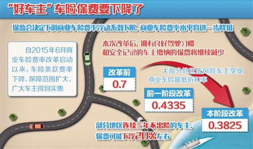“从目前来看,车险改革推出的扩大费率下浮空间的政策,让消费者有望获得更大的保费优惠。改革前车险保费折扣最低为7折,一轮改革后‘七折令’取消,低风险车主最低折扣在4.3折左右。本轮商业车险改革后,预计最低折扣可下降至3.8折左右。消费者有更大的受惠空间。”保监会财产保险监管部主任刘峰说。