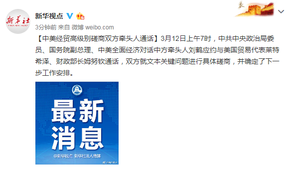 3月12日上午7时,中共中央政治局委员、国务院副总理、中美全面经济对话中方牵头人刘鹤应约与美国贸易代表莱特希泽、财政部长姆努钦通话,双方就文本关键问题进行具体磋商,并确定了下一步工作安排。